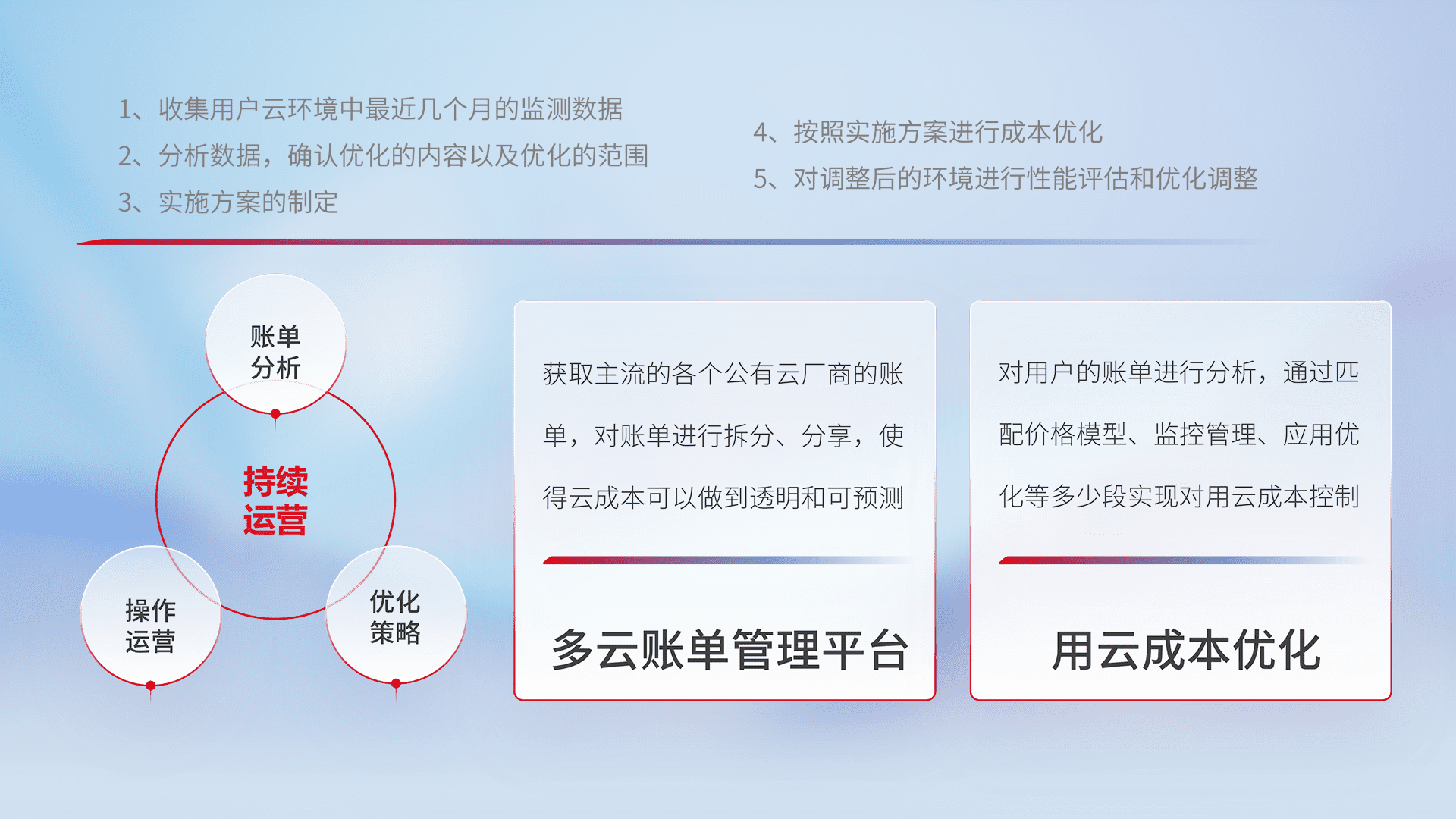 通过多云纳管,,,,以统一的资源数据模型把客户的云资源进行抽象和封装,,,,进而实现对多云资源的统一操作,,,,保障云资源管理的可靠性、、、稳定性与可用性。。。量身定制化运维内容,,,,配置、、、开发运维、、补丁管理、、、、备份、、监控、、、认证和访问管理、、、审计和日常巡检等,,保障在用云过程中的可靠度,,稳定度以及高可用率。。